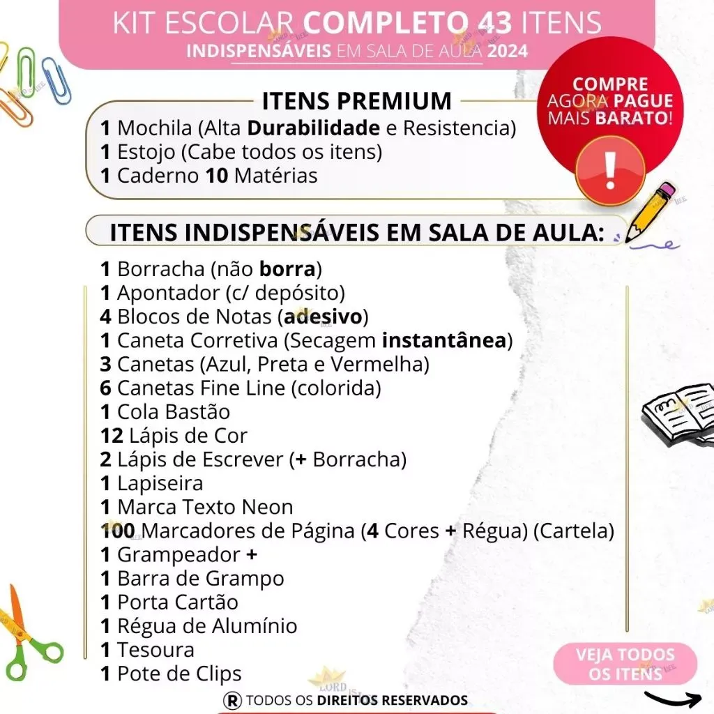 Kit Material Escolar Completo com 43 itens unitĂĄrios, cuidadosamente selecionados para atender Ă s necessidades do aluno em sala de aula.